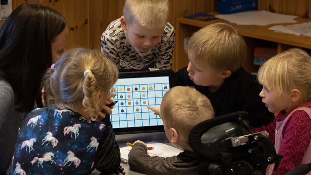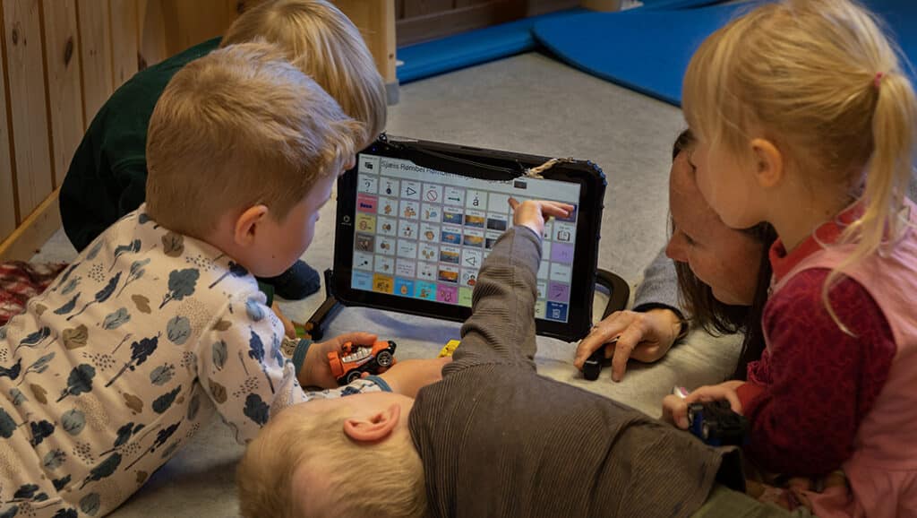 – Nå er det min tur å trykke på skjermen! Hva betyr det bildet? Barna i Lesjaskog friluftsbarnehage sitter på gulvet og leker. At Alf ikke bruker talestemmen, tenker ingen på. Grafiske symboler er hans stemme. At han kommuniserer via skjerm og grafiske symboler, er blitt helt naturlig – og litt spennende.