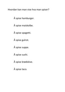 5. Klipp opp i lapper med de ulike setningene. En trekker en lapp, oversetter lappen til tegnspråk uten å si tegnet for det som spises. Den andre gjetter hva som står på lappen..