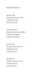 5. Klipp opp i lapper med de ulike setningene. En trekker en lapp, oversetter lappen til tegnspråk uten å si tegnet for det som spises. Den andre gjetter hva som står på lappen.