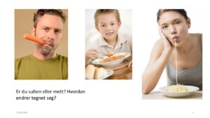 1. Bruk gjerne lysbildene du kan laste ned under. Snakk sammen om tegnet endrer seg dersom man har en tilleggsopplysning om at den som spiser: