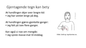 - Spør om hvordan vi viser at en handling varer over tid på tegnspråk. Vis noen eksempler.